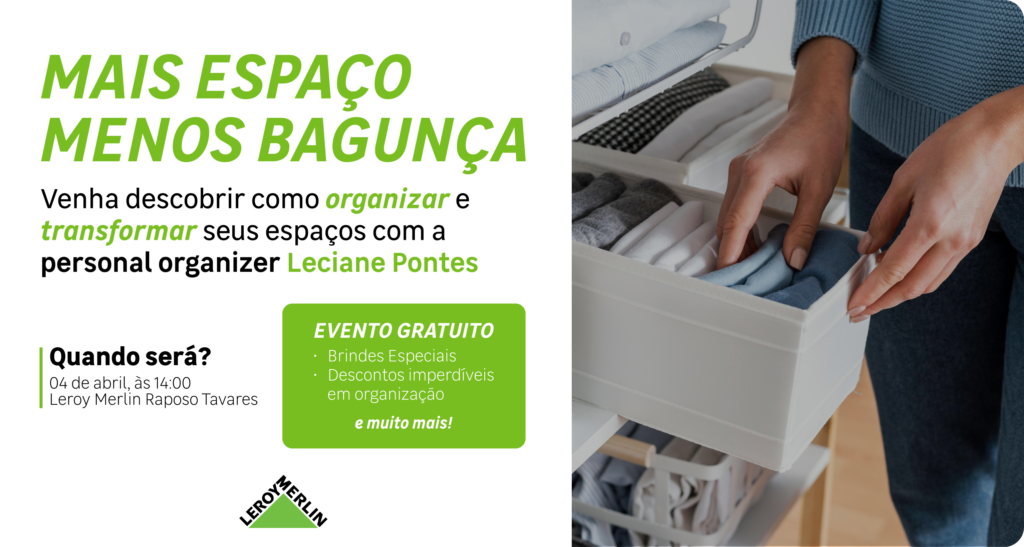 A Leroy Merlin Raposo Tavares preparou um evento especial para quem quer mais organização, funcionalidade e bem-estar no dia a dia. Venha nos visitar e saiba como otimizar espaços para transformar seu ambiente!