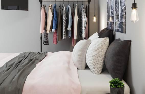Para um quarto de casal de apartamento pequeno, esses móveis são ideais e peças curinga! Para pequenos cantos, um cabideiro de pé ou cabide de parede ocupa um espaço reduzido e acomoda apropriadamente as roupas usadas no dia a dia.