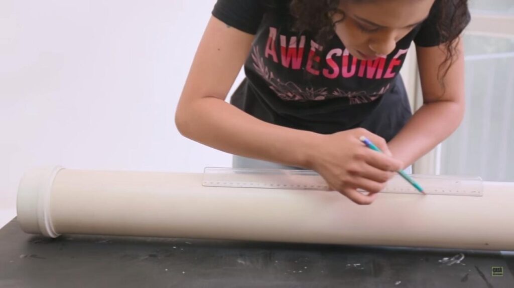 1º passo: Comece desenhando com um lápis o formato do jardim em cima dos canos. Você vai precisar fazer uma abertura retangular na parte de cima dele com tamanho suficiente para que as mudas escolhidas sejam plantadas. Utilize uma régua ou um pedaço de madeira: nesse momento, é necessário que a linha fique bem reta;