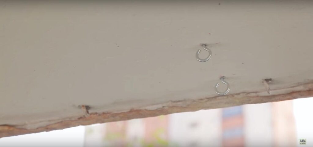 6º passo: Faça quatro furos no teto onde a horta vertical ficará pendurada e instale os ganchos para correntes. É importante que os espaços entre cada um deles sejam proporcionais ao tamanho dos canos;