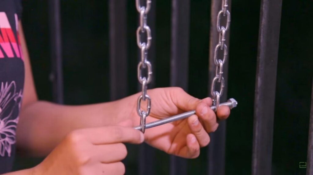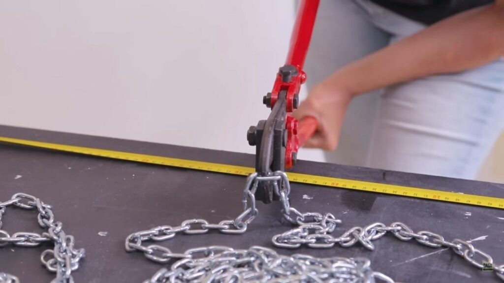 7º passo: Determine a altura que vai ter o seu arranjo de acordo com o espaço disponível no local onde sua horta vertical vai ficar. Depois disso, com o alicate, corte quatro pedaços de corrente do mesmo tamanho para a montagem da estrutura;