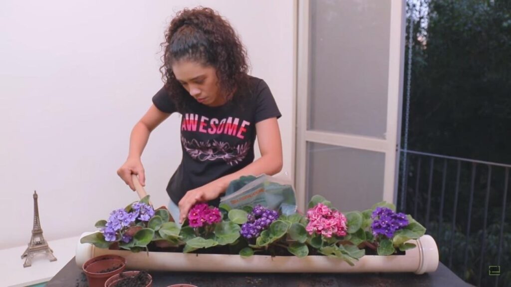 9º passo: Com a estrutura montada, chega a hora de plantar: coloque uma camada de geomanta no fundo do cano de PVC, cubra com a argila expandida, o substrato e as mudas que você deseja plantar. Finalize preenchendo o espaço entre elas com terra;