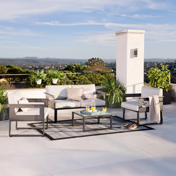 Um conjunto para jardim com sofá, poltrona e mesa de centro, por exemplo, contribui para criar essa continuidade com leveza e sofisticação, ajudando a aquecer o espaço e reforçar a sensação de aconchego.
