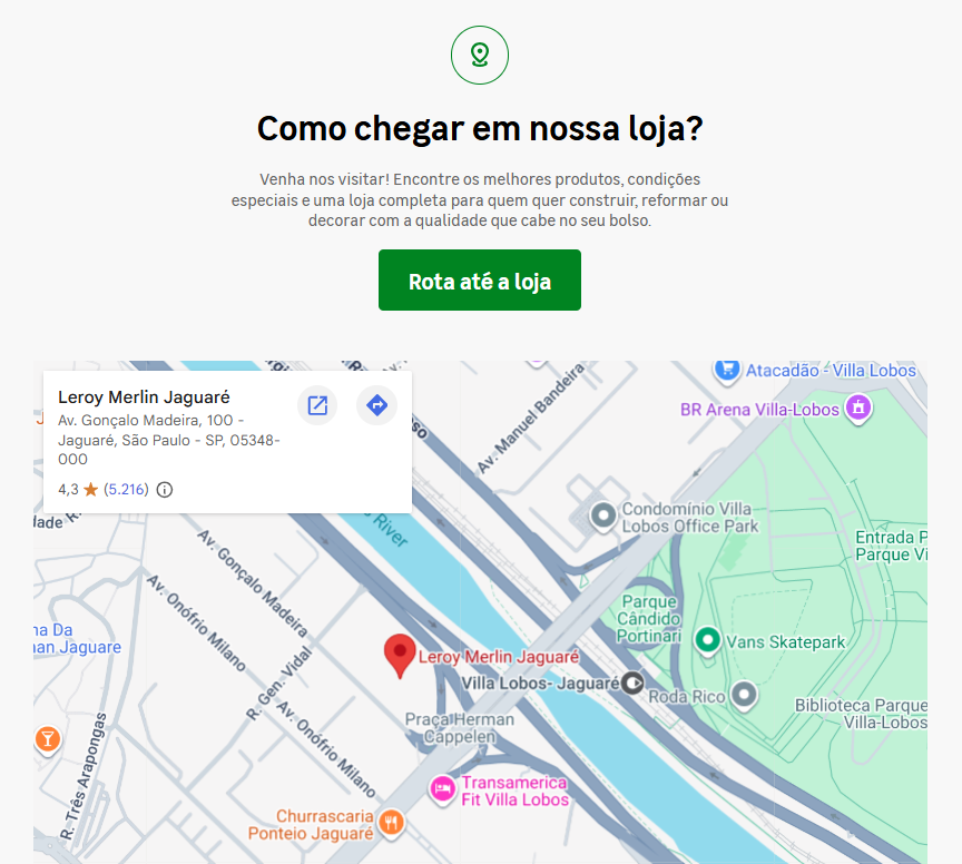Confira como chegar na loja, passe na Leroy Merlin Jaguaré e descubra tudo o que você precisa para levar mais conforto, estilo e bem-estar para dentro da sua casa. Aproveite seu cupom exclusivo do Programa de Fidelidade, explore nossos ambientes inspiradores e conte com nossos especialistas para transformar suas ideias em realidade. Te esperamos por lá!