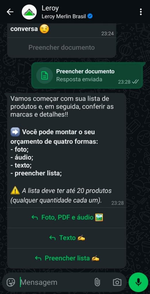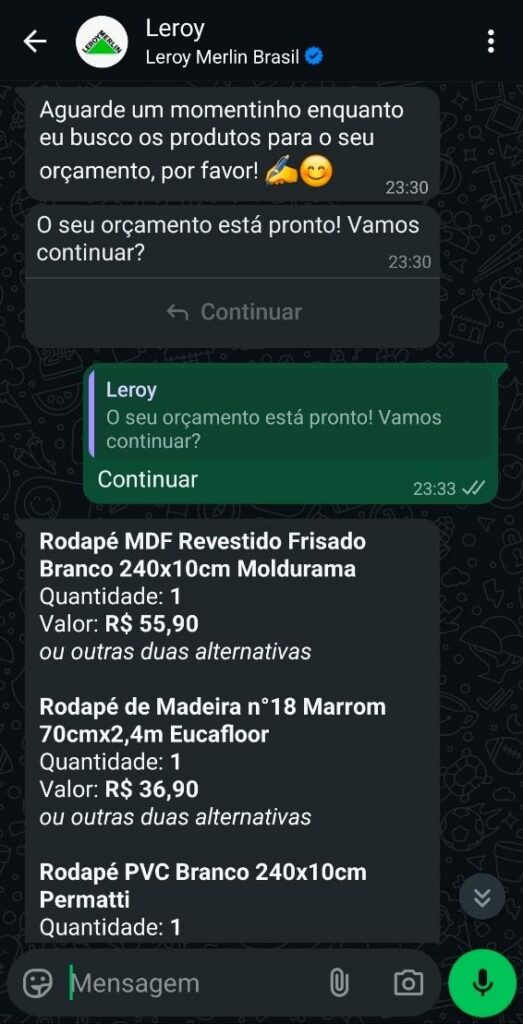 Você acessa o OrçaFácil mandando uma mensagem pelo WhatsApp da Leroy Merlin: