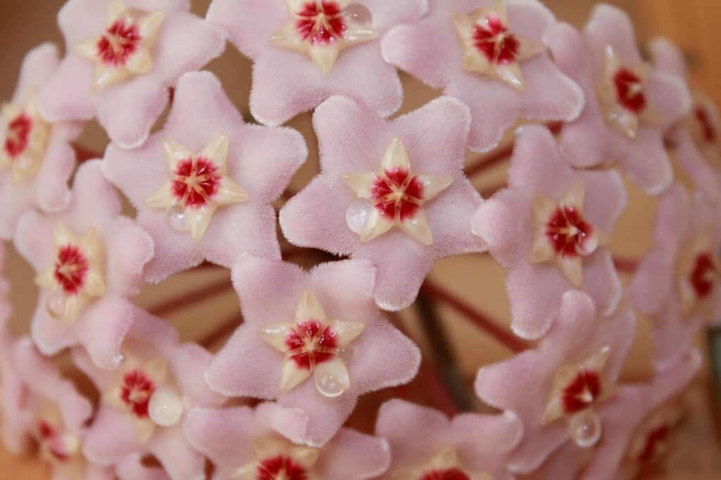 A flor de cera tem esse nome curioso e logo a gente percebe o motivo: ela tem flores bem delicadas e com uma textura que lembra a cera.